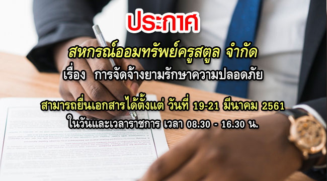 ด้วยสหกรณ์ออมทรัพย์ครูสตูล จำกัด โดยมติที่ประชุมคณะกรรมการดำเนินการ มิมติให้สหกรณ์ประกาศการจัดจ้างผู้รับจ้างรักษาความปลอดภัย ณ สำนักงานสหกรณ์ออมทรัพย์ครูสตูล จำกัด ขอสงวนสิทธิ์ในการพิจารณาจัดจ้างหรือไม่ก็ได้ ทั้งนี้สามารถยื่นเอกสารได้ตั้งแต่ วันที่ 19-21 มีนาคม 2561 ในวันและเวลาราชการ