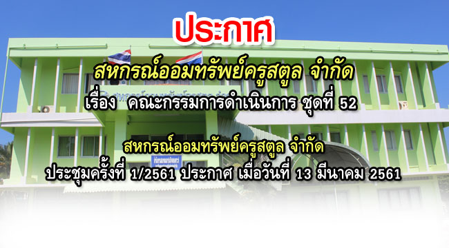 ด้วยมติที่ประชุมคณะกรรมการดำเนินการสหกรณ์ออมทรัพย์ครูสตูล จำกัด ชุดที่ 52 ประชุมครั้งที่ 1/2561 เมื่อวันที่ 13 มีนาคม 2561 ได้มีการเลือกตั้งกรรมการตำแหน่งต่างๆ และผลการเลือกตั้งปรากฏ ดังนี้