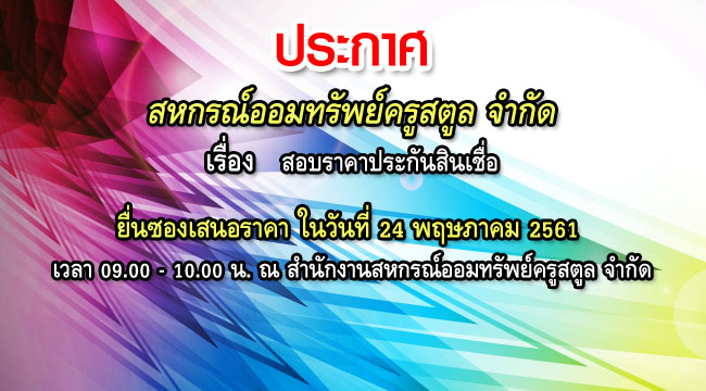 ด้วยสหกรณ์ออมทรัพย์ครูสตูล จำกัด มีความประสงค์ให้บริษัทประกันที่สนใจเสนอราคาการรับประกันสินเชื่อเงินกู้สามัญ โดยมีเงื่อนไขกรมธรรม์และรายละเอียด ดังนี้