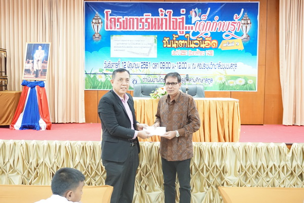 สหกรณ์ออมทรัพย์ครูสตูล จำกัด โดยนายสะอาด อุสมา ประธานกรรมการ ร่วมมอบเงินสนับสนุน โครงการรินน้ำใจสู่เด็กกำพร้าซับน้ำตาในวันอีด ครั้งที่ 9 ประจำปี 2561 เพื่อเป็นการช่วยเหลือเด็กนักเรียนที่กำพร้าและยากจน ให้มีผ้าใหม่ใส่ในวันอีด โดยมีกลุ่มเป้าหมายเป็นนักเรียนที่นับถือศาสนาอิสลาม ตั้งแต่ชั้นอนุบาล – ม.3 ในโรงเรียนของรัฐ โรงเรียนละ 2 คน ภายในจังหวัดสตูล วันที่ 12 มิถุนายน 2561 เวลา 08.00 – 12.00 น. ณ หอประชุมวิทยาลัยชุมชนสตูล อำเภอเมือง จังหวัดสตูล