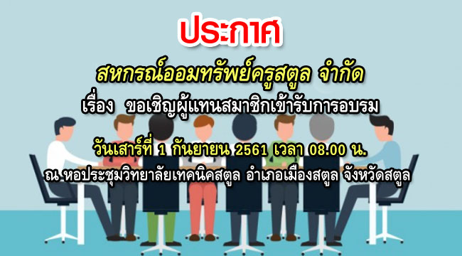 ด้วยสหกรณ์ออมทรัพย์ครูสตูล จำกัด กำหนดจัดการอบรมผู้แทนสมาชิก ในหัวข้ออบรม “กฎหมาย ข้อบังคับ และระเบียบที่เกี่ยวกับสหกรณ์” โดยวิทยากร นายมนุชาธิป วรกาญจนานนท์ นักวิชาการสหกรณ์ชำนาญการพิเศษ สำนักงานสหกรณ์จังหวัดสงขลา ในวันเสาร์ที่ 1 กันยายน 2561 เวลา 08.00 น. เป็นต้นไป ณ หอประชุมวิทยาลัยเทคนิคสตูล ตำบลพิมาน อำเภอเมืองสตูล จังหวัดสตูล