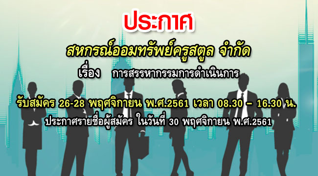 ด้วยสหกรณ์ออมทรัพย์ครูสตูล จำกัด จะดำเนินการสรรหาคณะกรรมการดำเนินการ ประจำปี 2562 และนำเสนอต่อที่ประชุมใหญ่สามัญประจำปี 2561 เพื่อเลือกตั้งเป็นคณะกรรมการดำเนินการสหกรณ์ออมทรัพย์ครูสตูล จำกัด โดยให้เป็นไปตามพระราชบัญญัติสหกรณ์ พ.ศ. 2542 ข้อบังคับ และระเบียบสหกรณ์ฯว่าด้วยการสรรหากรรมการดำเนินการ พ.ศ. 2559 และได้กำหนดรับสมัครกรรมการดำเนินการสหกรณ์ออมทรัพย์ครูสตูล จำกัด แทนตำแหน่งที่หมดวาระ ในระหว่างวันที่ 26-28 พฤศจิกายน 2561 ณ ฝ่ายอำนวยการ ชั้น 2 สำนักงานสหกรณ์ออมทรัพย์ครูสตูล จำกัด อำเภอเมือง จังหวัดสตูล