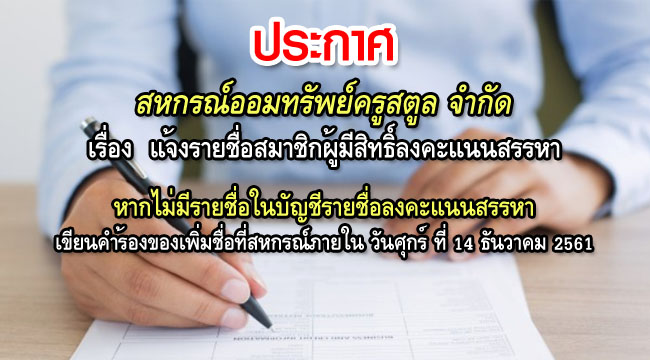 ในการนี้ทางสหกรณ์ออมทรัพย์ครูสตูล จำกัด ขอความร่วมมือท่านช่วยแจ้งสมาชิกในหน่วยงานของท่านตรวจสอบรายชื่อในบัญชีรายชื่อผู้มีสิทธิ์ลงคะแนนสรรหา และหากไม่มีรายชื่อในบัญชีรายชื่อลงคะแนนสรรหา ให้แจ้งโดยยื่นคำร้องเป็นลายลักษณ์อักษรต่อสหกรณ์ออมทรัพย์ครูสตูล จำกัด อำเภอเมือง จังหวัดสตูล หรือสาขาละงู หรือทางโทรสาร 074 – 772187 ภายในวันศุกร์ ที่ 14 ธันวาคม 2561 หากพ้นกำหนด จะไม่มีสิทธิ์ลงคะแนนสรรหากรรมการดำเนินการสหกรณ์ออมทรัพย์ครูสตูล จำกัด