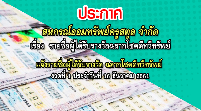 ด้วยสหกรณ์ออมทรัพย์ครูสตูล จำกัด ได้จัดทำโครงการเงินฝาก “โชคดีทวีทรัพย์” ตั้งแต่วันที่ 2-31 กรกฎาคม พ.ศ. 2561 ที่ผ่านมา โดยทุกการฝากเงิน 5,000 บาทในโครงการ จะได้รับฉลาก 1 ใบ เพื่อลุ้นโชค โดยอ้างอิงเลขหางบัตรตามรางวัลฉลากกินแบ่งรัฐบาล เลขท้าย 3 ตัว และ 2 ตัว ของงวดนั้น บัดนี้จึงขอแจ้งรายชื่อผู้ได้รับรางวัล ฉลากโชคดีทวีทรัพย์ งวดที่ 1 ประจำวันที่ 16 ธันวาคม 2561
