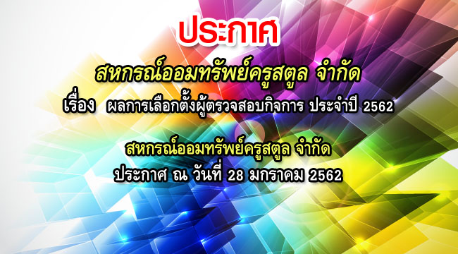 อาศัยความตามข้อ 103, 103/1, 104/1, 105/1 และข้อ 106 แห่งข้อบังคับสหกรณ์ออมทรัพย์ครูสตูล จำกัด สหกรณ์ออมทรัพย์ครูสตูล จำกัด แก้ไขเพิ่มเติม (ฉบับที่ 2) พ.ศ.2561 ว่าด้วย ผู้ตรวจสอบกิจการ และสหกรณ์ออมทรัพย์ครูสตูล จำกัด ได้ประกาศรับสมัครผู้ตรวจสอบกิจการ เมื่อวันที่ 22 มกราคม 2562 และในวันที่ 27 มกราคม 2562 ที่ประชุมใหญ่สามัญประจำปี 2561 ได้พิจารณาเลือกตั้งผู้ตรวจสอบกิจการประจำปี 2562