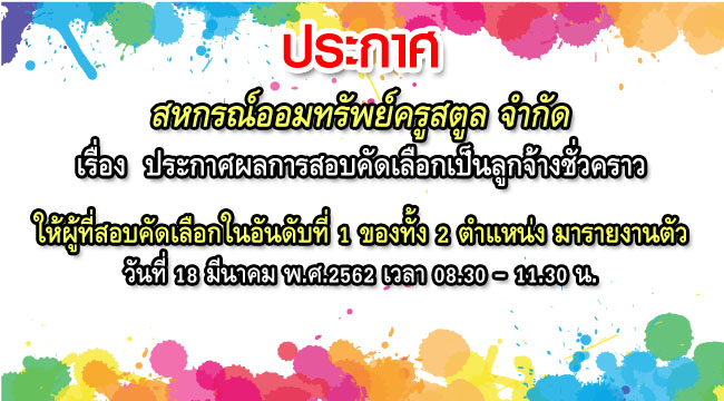 - ตามที่สหกรณ์ออมทรัพย์ครูสตูล จำกัด ได้ประกาศรับสมัครบุคคลทั่วไป เพื่อสอบคัดเลือกเป็นลูกจ้างชั่วคราวสหกรณ์ออมทรัพย์ครูสตูลจำกัด ปฏิบัติหน้าที่ตำแหน่ง (1)การจัดการทั่วไป จำนวน 1 อัตรา (2)การเงินและบัญชี จำนวน 1 อัตรา ประกาศ ณ วันที่ 21 กุมภาพันธ์ พ.ศ.2562 นั้น