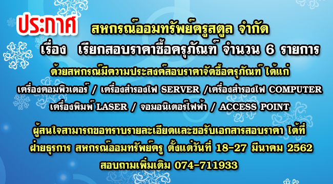 ด้วยสำนักงานสหกรณ์ออมทรัพย์ครูสตูล จำกัด โดยคณะกรรมการดำเนินการ ประชุมครั้ง 3/2562 ลงวันที่ 15 มีนาคม 2562 เรื่อง การจัดซื้อ จัดจ้าง ครุภัณฑ์ มีความประสงค์จะสอบราคาซื้อครุภัณฑ์ จำนวน 6 รายการ ปีงบประมาณ 2562 โดยมีรายละเอียดและเงื่อนไขในการสอบราคา