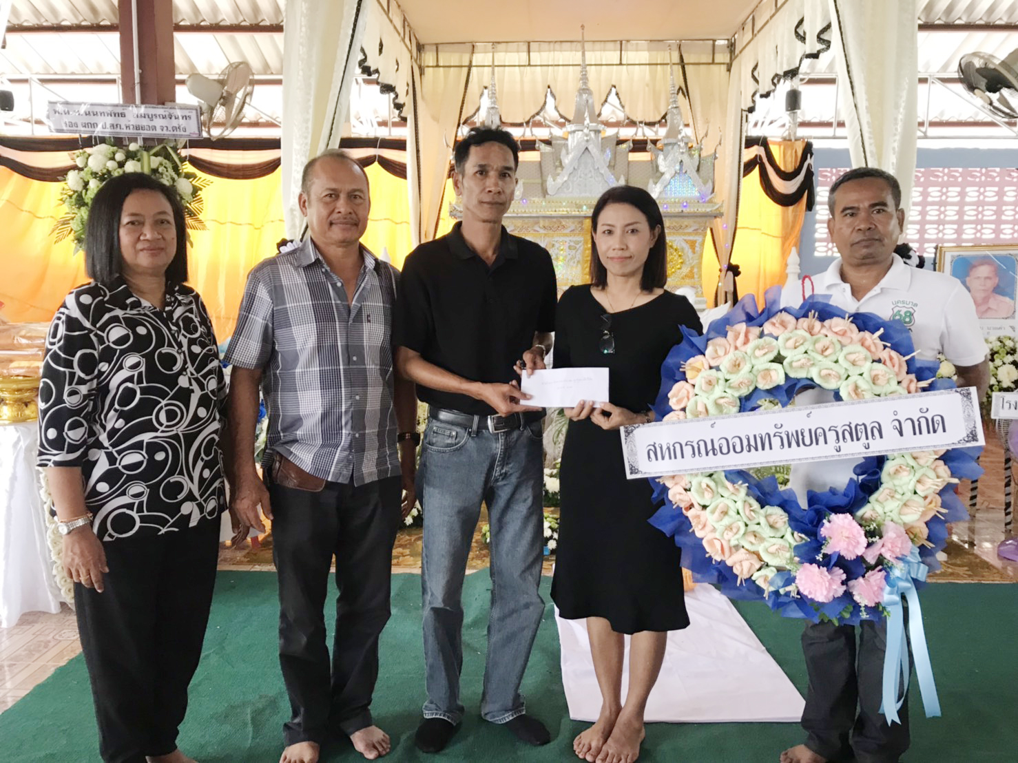 วันที่ 13 พฤษภาคม 2562 สหกรณ์ออมทรัพย์ครูสตูล จำกัด โดยนายเสรี มากแสง กรรมการ มอบเงินฌาปนกิจสงเคราะห์ศพครอบครัวสมาชิกเสียชีวิตให้แก่ นางสุภรรณี พงศาปาน จำนวนเงิน 5,000 บาท พร้อมพวงหรีด ณ วัดราษฎร์ประชา หมู่ที่ 7 ตำบลอุใดเจริญ อำเภอควนกาหลง จังหวัดสตูล