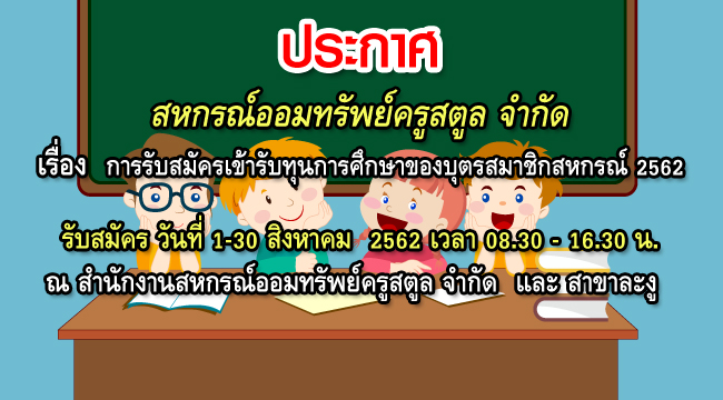 ด้วยสหกรณ์ออมทรัพย์ครูสตูล จำกัด โดยมติที่ประชุมคณะกรรมการดำเนินการ ชุดที่ 53 ครั้งที่ 7/2562 เมื่อวันที่ 25 กรกฎาคม พ.ศ. 2562 มีมติให้สหกรณ์ฯ ประกาศรับสมัครบุตรของสมาชิกสหกรณ์ออมทรัพย์ครูสตูล จำกัด เข้ารับทุนการศึกษาประจำปี 2562 โดยรับสมัครตั้งแต่วันที่ 1-30 สิงหาคม 2562 ในวันและเวลาทำการ ณ สำนักงานสหกรณ์ออมทรัพย์ครูสตูล จำกัด และสำนักงานสหกรณ์ออมทรัพย์ครูสตูล จำกัด สาขาละงู