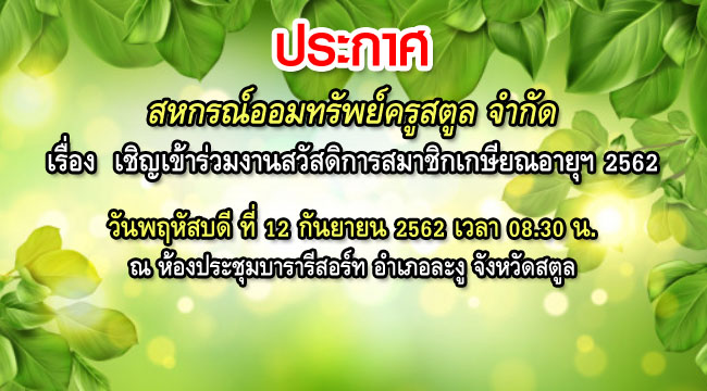ด้วยสหกรณ์ออมทรัพย์ครูสตูล จำกัด ได้จัดให้มีสวัสดิการสำหรับผู้เกษียณอายุราชการ หรือลาออกจากราชการเป็นประจำทุกปี และเพื่อให้สมาชิกได้รับทราบข้อมูลสิทธิประโยชน์สวัสดิการต่างๆ และรับฟังการบรรยายพิเศษ “หัวข้อ การใช้ชิวิตหลังเกษียณ” ทางสหกรณ์ฯ จึงจัดให้มีการพบปะระหว่างสหกรร์และสมาชิกผู้เกษียณฯ จึงใคร่ขอ เรียนเชิญสมาชิกผู้เกษียณอายุราชการ หรือลาออกจากราชการในปี 2562 เข้าร่วมงาน ในวันพฤหัสบดี ที่ 12 กันยายน 2562 เวลา 08.30 น. ณ ห้องประชุมบารารีสอร์ท อำเภอละงู จังหวัดสตูล โดยจะมีการมอบเงินสวัสดิการและของที่ระลึกให้แก่สมาชิกผู้เกษียณฯ ทุกท่าน