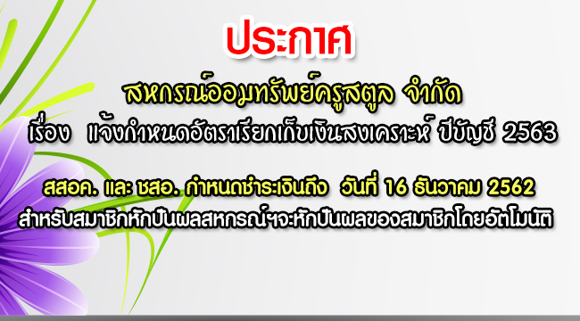 ด้วยสหกรณ์ออมทรัพย์ครูสตูล จำกัด ได้เป็นศูนย์ประสานงานของสมาคมฌาปนกิจสงเคราะห์สหกรณ์สมาชิกชุมนุมสหกรณ์ออมทรัพย์ครูไทย (สสอค.) และสมาคมฌาปนกิจสงเคราะห์สหกรณ์สหกรณ์สมาชิกของชุมนุมสหกรณ์ออมทรัพย์แห่งประเทศไทย (สส.ชสอ.) ขอความร่วมมือทางโรงเรียนและหน่วยงานประชาสัมพันธ์ เรื่อง การเรียกเก็บเงินสงเคราะห์ สำหรับปีบัญชี 2563 โดยกำหนดชำระเงินตั้งแต่บัดนี้ ถึง วันที่ 16 ธันวาคม 2562 (สำหรับสมาชิกหักปันผลทางสหกรณ์ฯจะหักปันผลของสมาชิกโดยอัตโมนัติ)