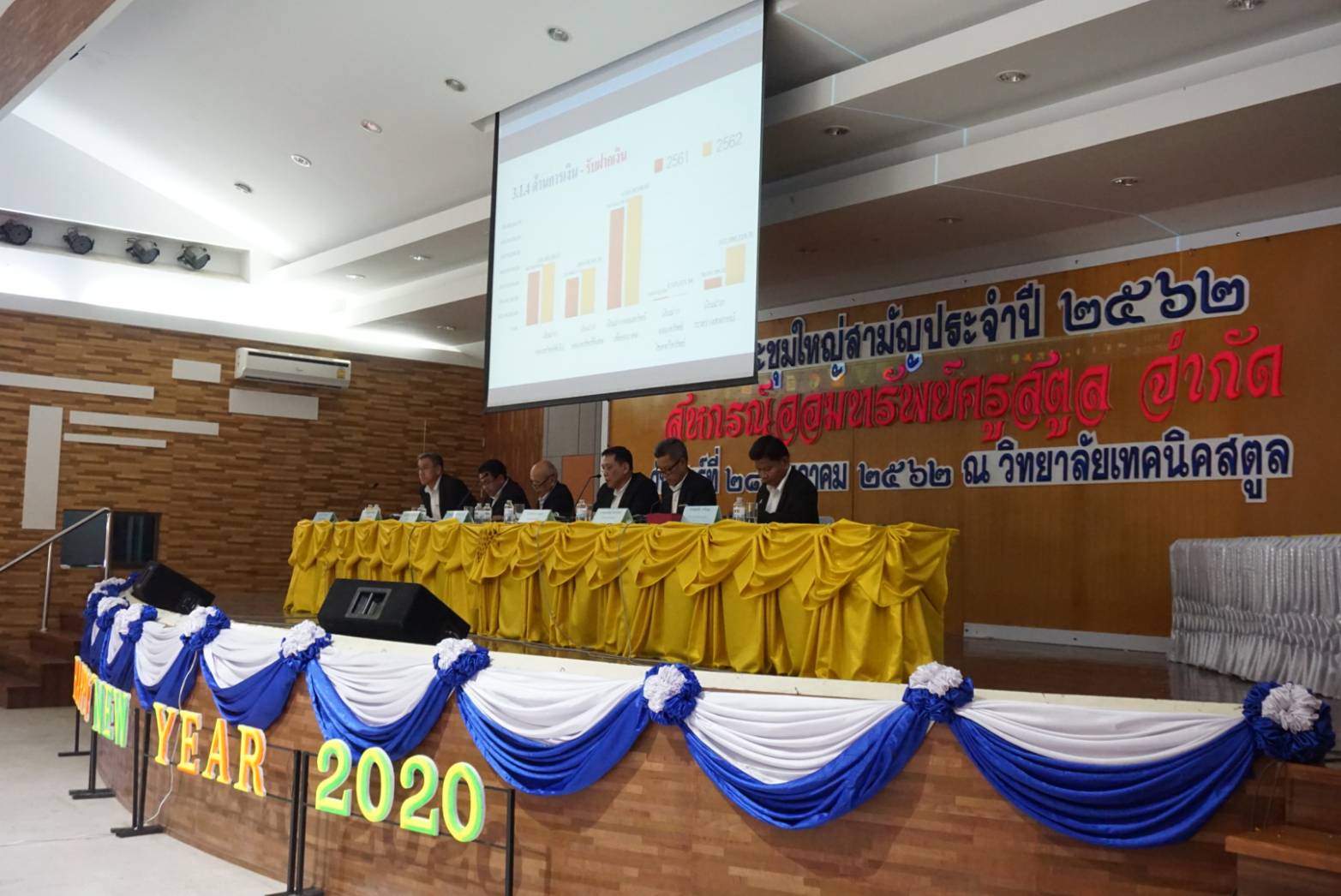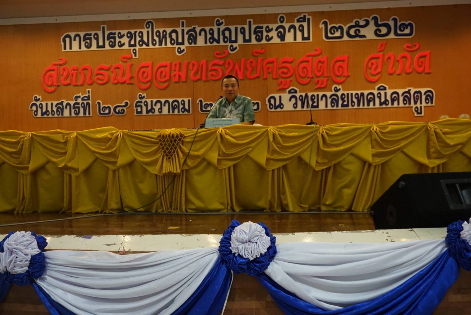 วันที่ 28 ธันวาคม 2562 สหกรณ์ออมทรัพย์ครูสตูล จำกัด จัดการประชุมใหญ่สามัญ ประจำปี 2562 ณ หอประชุมวิทยาลัยเทคนิคสตูล อำเภอเมือง จังหวัดสตูล โดยมีท่านผู้ว่าราชการจังหวัดสตูล นายจีรนันท์ เพ็งจันทร์ ให้เกียรติมาเป็นประธานในพิธีเปิดการประชุม ซึ่งมีผู้แทนสมาชิกเข้าร่วมประชุม ประมาณ 400 คน