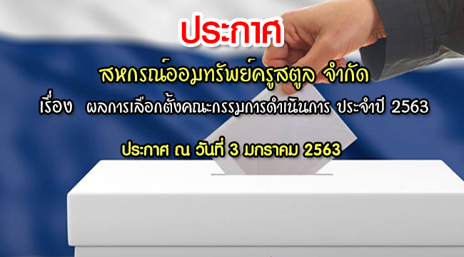 ตามที่ได้มีการลงคะแนนสรรหาคณะกรรมการดำเนินการสหกรณ์ออมทรัพย์ครูสตูล จำกัด กรณีครบวาระ จำนวน 8 คน เมื่อวันที่ 15 ธันวาคม 2563 นั้น คณะกรรมการดำเนินการเลือกตั้งฯ ได้ทำการแจ้งผลการสรรหาให้ที่ประชุมใหญ่สามัญประจำปี 2562 เมื่อวันที่ 28 ธันวาคม 2562 รับทราบ และให้ที่ประชุมใหญ่พิจารณาเลือกตั้งกรรมการดำเนินการ ซึ่งผลการเลือกตั้งคณะกรรมการดำเนินการ มีดังนี้