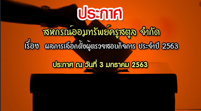 อาศัยความตามข้อ 103, 103/1, 104, 104/1, 105/1 และข้อ 106 แห่งข้อบังคับสหกรณ์สหกรณ์ออมทรัพย์ครูสตูล จำกัด สหกรณ์ออมทรัพย์ครูสตูล จำกัด แก้ไขเพิ่มเติม (ฉบับที่ 2) พ.ศ.2561 ว่าด้วย ผู้ตรวจสอบกิจการ และสหกรณ์ออมทรัพย์ครูสตูล จำกัด ได้ประกาศรับสมัครผู้ตรวจสอบกิจการ และเลือกตั้งในวันที่ 28 ธันวาคม 2562 ที่ประชุมใหญ่สามัญประจำปี 2562 ได้พิจารณาเลือกตั้งผู้ตรวจสอบกิจการ ประจำปี 2563 ซึ่งผลการเลือกตั้งผู้ตรวจสอบกิจการสหกรณ์ออมทรัพย์ครูสตูล จำกัด ประจำปี 2563 มีดังนี้