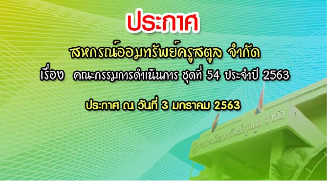 ด้วยมติที่ประชุมคณะกรรมการดำเนินการสหกรณ์ออมทรัพย์ครูสตูล จำกัด ชุดที่ 54 ประชุมครั้งที่ 1/2563 เมื่อวันที่ 2 มกราคม 2563 ได้มีการเลือกตั้งกรรมการตำแหน่งต่างๆ และผลการเลือกตั้งปรากฏ ดังนี้