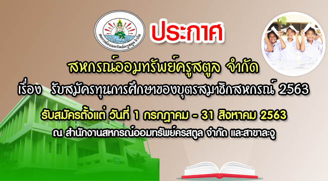 ด้วยสหกรณ์ออมทรัพย์ครูสตูล จำกัด โดยมติที่ประชุมคณะกรรมการดำเนินการ ชุดที่ 54 ครั้งที่ 9/2563 เมื่อวันที่ 22 มิถุนายน พ.ศ. 2563 มีมติให้สหกรณ์ฯ ประกาศรับสมัครบุตรของสมาชิกสหกรณ์ออมทรัพย์ครูสตูล จำกัด เข้ารับทุนการศึกษาประจำปี 2563 โดยรับสมัครตั้งแต่วันที่ 1 กรกฎาคม – 31 สิงหาคม 2563 ในวันและเวลาทำการ ณ สำนักงานสหกรณ์ออมทรัพย์ครูสตูล จำกัด สำนักงานใหญ่ และ สาขาละงู