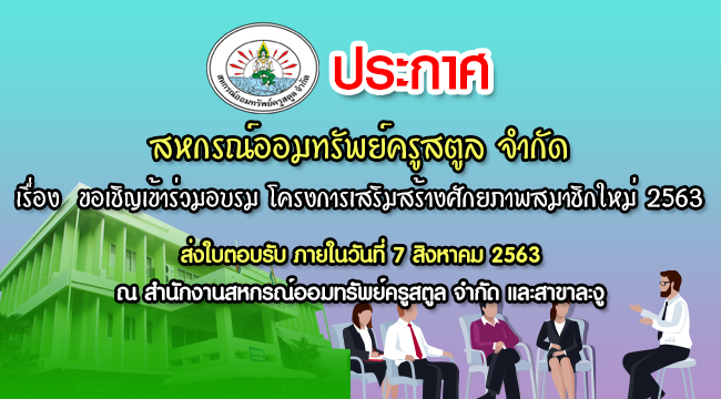 ด้วยสหกรณ์ออมทรัพย์ครูสตูล จำกัด โดยมติที่ประชุมใหญ่สามัญประจำปี 2562 เมื่อวันที่ 28 ธันวาคม พ.ศ.2562 อนุมัติดำเนินการอบรม “โครงการเสริมสร้างศักยภาพสมาชิกใหม่ สหกรณ์ออมทรัพย์ครูสตูล จำกัด” ประจำปี 2563 เพื่อให้ความรู้ความเข้าใจเกี่ยวกับหลักการต่างๆของสหกรณ์ แก่สมาชิกใหม่ที่ยังไม่ได้ผ่านการอบรม โดยเนื้อหาการอบรมครั้งนี้ประกอบด้วย เรื่องบทบาท สิทธิ และหน้าที่ของสมาชิกใหม่ที่พึงมี และประโยชน์ที่ได้รับหลังจากเป็นสมาชิกของสหกรณ์ฯ รวมถึงเรื่องอื่นๆที่เกี่ยวข้อง ทั้งนี้ มติที่ประชุมของคณะกรรมการดำเนินการ ครั้งที่10/2563 เมื่อวันที่ 20 กรกฎาคม พ.ศ.2563 ให้จัดการอบรมจำนวน 2 รุ่น กำหนดรุ่นละไม่เกิน 100 ท่าน ดังนี้ รุ่นที่ 1 วันเสาร์ ที่ 22 สิงหาคม 2563 เวลา 08.30-12.00น. ณ ห้องประชุมโรงเรียนพิมานพิทยาสรรค์ อ.เมืองสตูล จ.สตูล และ รุ่นที่ 2 วันอาทิตย์ ที่ 23 สิงหาคม 2563 เวลา 08.30-12.00 น. ณ หอประชุมโรงเรียนอนุบาลละงู อ.ละงู จ.สตูล