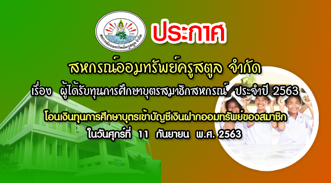 ด้วยสหกรณ์ออมทรัพย์ครูสตูล จำกัด โดยมติที่ประชุมคณะกรรมการดำเนินการ มีมติให้ สหกรณ์ฯ ประกาศรับสมัครบุตรสมาชิกสหกรณ์ออมทรัพย์ครูสตูล จำกัด เข้ารับทุนการศึกษาปี 2563 โดยเปิดรับสมัครตั้งแต่วันที่ 1 กรกฎาคม – 31 สิงหาคม 2563 ที่ผ่านมานั้น สหกรณ์ออมทรัพย์ครูสตูล จำกัด ขอประกาศรายชื่อผู้ได้รับทุนการศึกษาบุตรสมาชิก แยกตามระดับการศึกษาของบุตรสมาชิก