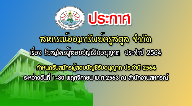 ด้วยสหกรณ์ออมทรัพย์ครูสตูล จำกัด จะประชุมใหญ่สามัญประจำปี 2563 ในวันเสาร์ ที่ 26 ตุลาคม พ.ศ.2563 ณ หอประชุมโรงเรียนสตูลวิทยา อ.เมือง จ.สตูล และที่ประชุมใหญ่จะคัดเลือกผู้สอบบัญชีรับอนุญาตเพื่อเข้าตรวจสอบบัญชีของสหกรณ์ออมทรัพย์ครูสตูล จำกัด ในการนี้ทางสหกรณ์ฯ กำหนดรับสมัครผู้สอบบัญชีรับอนุญาต ประจำปี 2564 รอบปีบัญชี 1 ธันวาคม พ.ศ.2563 สิ้นสุด 30 พฤศจิกายน พ.ศ.2564 ระหว่างวันที่ 1-30 พฤศจิกายน พ.ศ.2563 โดยผู้สนใจส่งเรื่องสมัครได้ที่สหกรณ์ออมทรัพย์ครูสตูล จำกัด เลขที่ 458 หมู่ที่ 6 ถนนยนตรการกำธร ตำบลคลองขุด อำเภอเมืองสตูล จังหวัดสตูล โทรศัพท์ 074 – 711933 ในวันและเวลาทำการของสหกรณ์ออมทรัพย์ครูสตูล จำกัด หรือทาง E-mail : sttcoop2@gmail.com