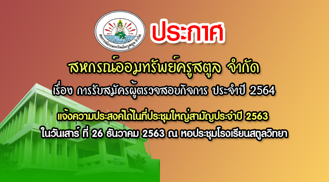 ด้วยสหกรณ์ออมทรัพย์ครูสตูล จำกัด จะดำเนินการเลือกตั้งผู้ตรวจสอบกิจการ ประจำปี 2564 ในที่ประชุมใหญ่สามัญประจำปี 2563 เป็นไปตามข้อบังคับข้อบังคับสหกรณ์ออมทรัพย์ครูสตูล จำกัด ฉบับแก้ไขเพิ่มเติม (ฉบับที่ 2) พ.ศ.2561 ข้อ 103 ,103/1 และข้อ 104 จึงกำหนดการรับสมัครผู้ตรวจสอบกิจการ ประจำปี 2564