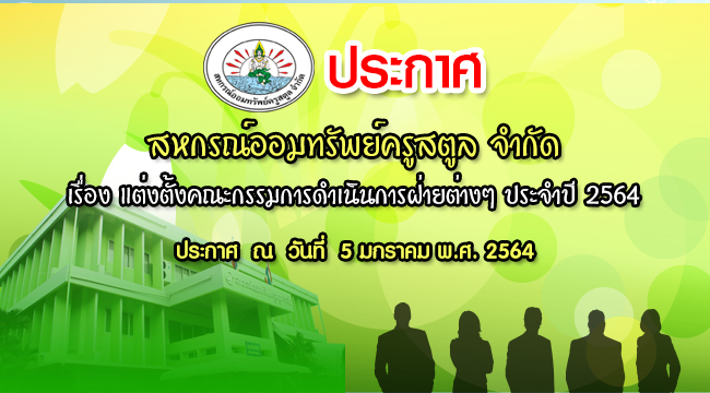 ด้วยสหกรณ์ออมทรัพย์ครูสตูล จำกัด โดยมติที่ประชุมคณะกรรมการดำเนินการ ครั้งที่ 1/2564 เมื่อวันที่ 4 มกราคม พ.ศ.2564 มีมติแต่งตั้งคณะกรรมการดำเนินการตำแหน่งต่างๆ และแต่งตั้งคณะกรรมการดำเนินการฝ่ายต่างๆ ของสหกรณ์ออมทรัพย์ครูสตูล จำกัด ประจำปี 2564 ดังต่อไปนี้