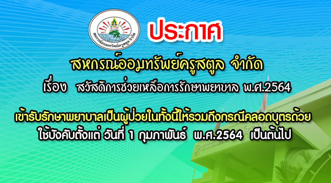 อาศัยอำนาจตามความในข้อบังคับของสหกรณ์ออมทรัพย์ครูสตูล จำกัด ข้อ 80(8) 108(11) โดยมติคณะกรรมการดำเนินการชุดที่ 55 ประจำปี 2564 ในคราวประชุมครั้งที่ 2 /2564 เมื่อวันที่ 22 มกราคม พ.ศ.2564 จึงได้กำหนดระเบียบสหกรณ์ออมทรัพย์ครูสตูล จำกัด ว่าด้วยสวัสดิการช่วยเหลือการรักษาพยาบาล พ.ศ.2564
