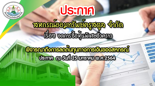 ด้วยสหกรณ์ออมทรัพย์ครูสตูล จำกัด โดยมติที่ประชุมคณะกรรมการดำเนินการสหกรณ์ออมทรัพย์ครูสตูล จำกัด ชุดที่ 55 ในคราวประชุมครั้งที่ 2/2564 เมื่อวันที่ 22 มกราคม พ.ศ.2564 ได้พิจารณาถึงการลดต้นทุนทางการเงินของสหกรณ์ ประกอบกับปัจจุบันสหกรณ์มีสภาพคล่องทางการเงินเพิ่มมากขึ้น เพื่อให้การบริหารการเงินเป็นไปอย่างมีประสิทธิภาพ จึงมีมติเป็นเอกฉันท์ให้สหกรณ์ออมทรัพย์ครูสตูล จำกัด งดการซื้อหุ้นพิเศษชั่วคราว ตั้งแต่บัดนี้เป็นต้นไป จนกว่าจะมีการเปลี่ยนแปลง