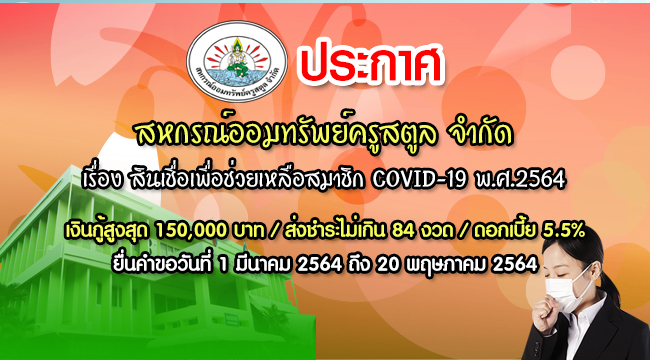 อาศัยมติที่ประชุมคณะกรรมการดำเนินการสหกรณ์ออมทรัพย์ครูสตูล จำกัด ชุดที่ 55 ในการประชุมครั้งที่ 3/2564 เมื่อวันที่ 24 กุมภาพันธ์ 2564 ได้กำหนดหลักเกณฑ์โครงการให้สินเชื่อเพื่อช่วยเหลือสมาชิกในสถานการณ์การแพร่ระบาดของเชื้อไวรัสโคโรนา 2019 (COVID-19) พ.ศ.2564