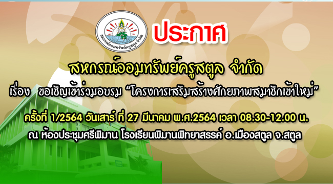 ด้วยสหกรณ์ออมทรัพย์ครูสตูล จำกัด โดยมติที่ประชุมใหญ่สามัญประจำปี 2563 เมื่อวันที่ 26 ธันวาคม พ.ศ.2563 อนุมัติดำเนินโครงการอบรม “เสริมสร้างศักยภาพสมาชิกใหม่ สหกรณ์ออมทรัพย์ครูสตูล จำกัด” เพื่อให้ความรู้ความเข้าใจเกี่ยวกับหลักการต่างๆของสหกรณ์ แก่สมาชิกใหม่ที่ยังไม่ได้ผ่านการอบรม โดยเนื้อหาการอบรมครั้งนี้ประกอบด้วย เรื่องบทบาท สิทธิ และหน้าที่ของสมาชิกใหม่ที่พึงมี และประโยชน์ที่ได้รับหลังจากเป็นสมาชิกของสหกรณ์ฯ รวมถึงเรื่องอื่นๆที่เกี่ยวข้อง ทั้งนี้ มติที่ประชุมของคณะกรรมการดำเนินการ ครั้งที่3/2564 เมื่อวันที่ 24 กุมภาพันธ์ พ.ศ.2564 กำหนดจัดการอบรมให้ความรู้ ครั้งที่ 1/2564 ในวันเสาร์ ที่ 27 มีนาคม พ.ศ.2564 เวลา 08.30-12.00 น. ณ ห้องประชุมศรีพิมาน โรงเรียนพิมานพิทยาสรรค์ อ.เมืองสตูล จ.สตูล