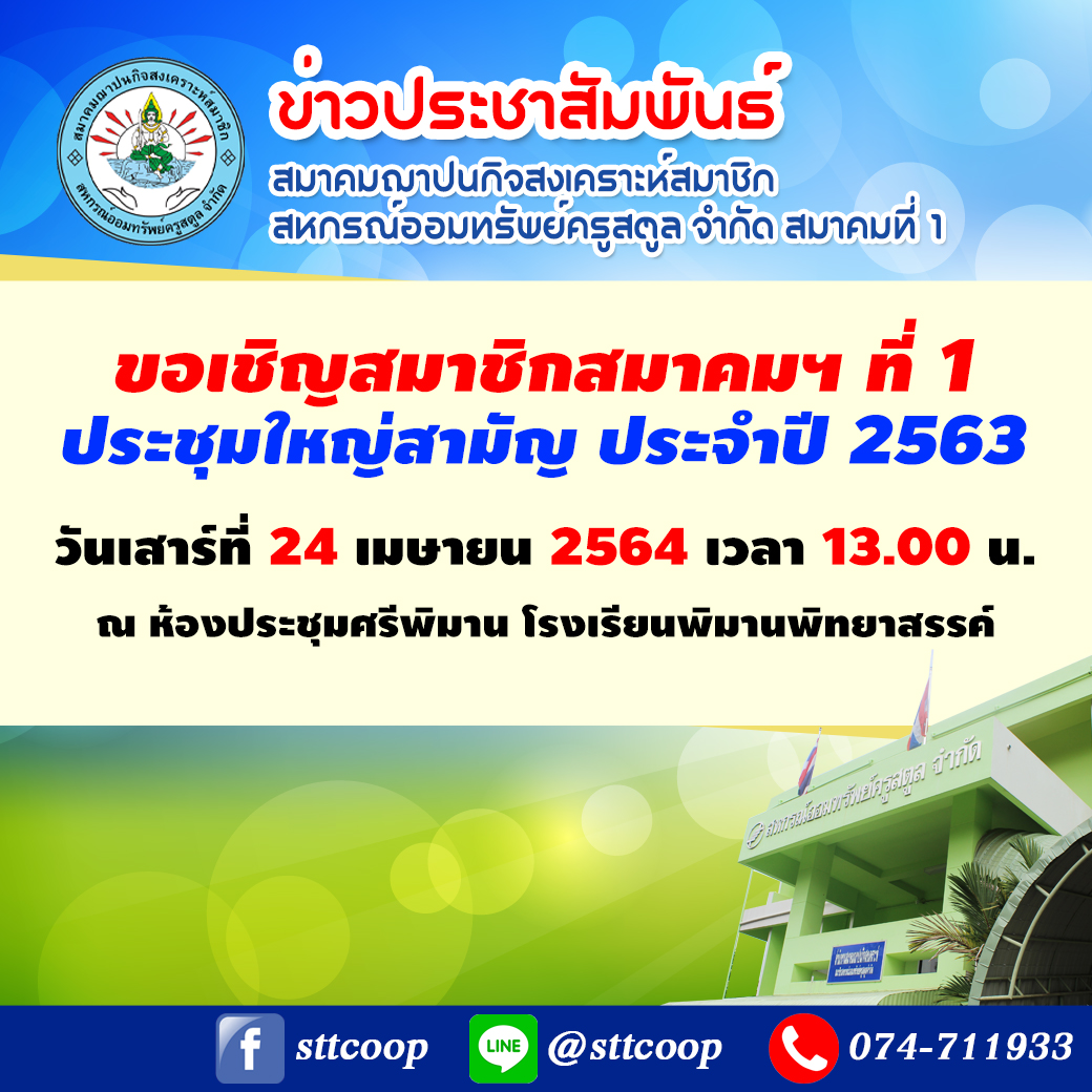 ด้วยคณะกรรมการบริหารสมาคมฌาปนกิจสงเคราะห์สมาชิกสหกรณ์ออมทรัพย์ครูสตูล จำกัด ได้มีการประชุม เมื่อวันที่ 22 มีนาคม 2564 มีมติให้ประชุมใหญ่สามัญประจำปี 2563 โดยกำหนดการประชุมใหญ่สามัญประจำปี 2563 ในวันเสาร์ ที่ 24 เมษายน พ.ศ.2564 เวลา 13.30 น. ณ ห้องประชุมศรีพิมาน โรงเรียนพิมานพิทยาสรรค์ ต.พิมาน อ.เมือง จ.สตูล ทั้งนี้ เพื่อให้เป็นไปตามข้อบังคับที่จะต้องจัดให้มีการประชุมใหญ่สามัญประจำปีไม่เกิน 120 วัน นับแต่วันสิ้นปี