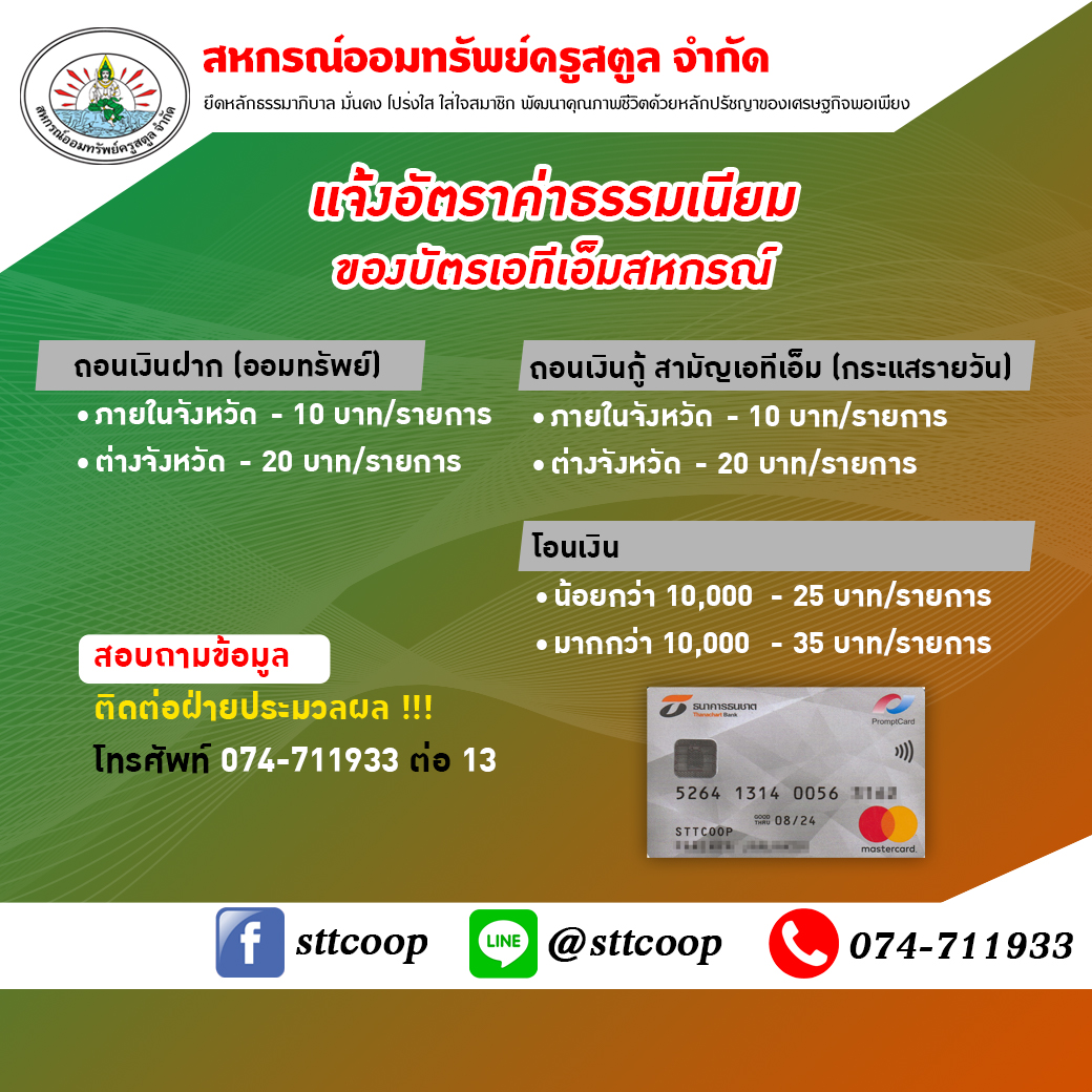 เนื่องด้วยสหกรณ์ใช้บริการบัตรเอทีเอ็มของธนาคารธนชาต โดยขณะนี้ธนาคารธนชาตได้มีการรวมกิจการกับธนาคารทหารไทย TMB ส่งผลให้จากเดิมที่ไม่มีการเก็บค่าธรรมเนียมกรณีการใช้งานผ่านตู้ของธนชาต เมื่อมีการรวมกิจการพบว่ามีการเก็บค่าธรรมเนียมในการใช้บริการเหมือนกับธนาคารอื่นๆ โดยบัตรเอทีเอ็มของสหกรณ์สามารถใช้ได้ทุกธนาคารและมีการเก็บค่าธรรมเนียม ดังนี้