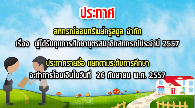 ประกาศรายชื่อ ผู้ได้รับทุนการศึกษาของบุตรสมาชิกสหกรณ์ ประจำปี 2557
